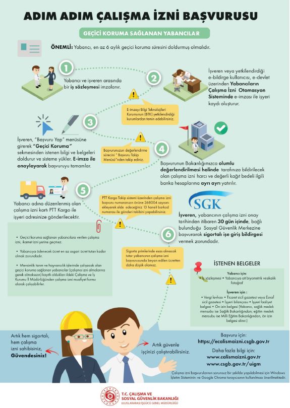 T.C Çalışma ve Sosyal Güvenlik Bakalnlığı Uluslararası İşgücü Genel Müdürlüğü’nce yayınlanan “ADIM ADIM ÇALIMA İZNİ BAŞVURUSU” adlı bildirisi yazımız ekindedir.
