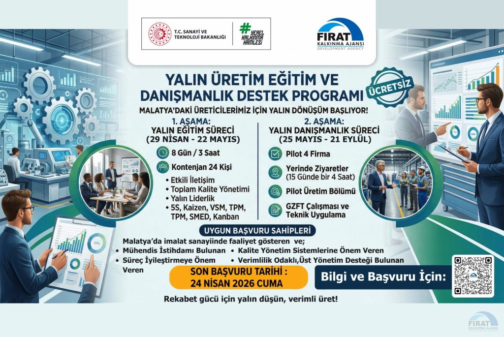 Fırat Kalkınma Ajansı tarafından, Sanayi ve Teknoloji Bakanlığı Kalkınma Ajansları Genel Müdürlüğü koordinasyonunda, Malatya ilinde faaliyet gösteren imalat sanayi firmalarına yönelik “2026 Yılı Yalın Üretim Temelli Eğitim ve Danışmanlık Programı” hayata geçirilecektir.